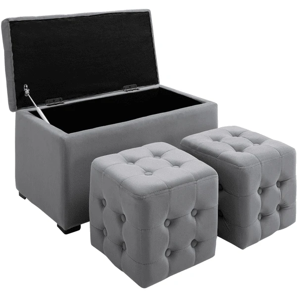 Diese stilvolle und schicke Aufbewahrungsbank passt perfekt in jedes Wohnzimmer, Schlafzimmer oder jeden Eingangsbereich. Mit seinem weichen Mikrofaserbezug ist dieser Ottomane ein echtes Highlight in jedem Raum. Der geräumige Innenraum ermöglicht es Ihnen Gegenstände wie Fernbedienungen oder zusätzliche Kissen und Decken oder sogar die beiden kleineren Ottomanen platzsparend zu verstauen.