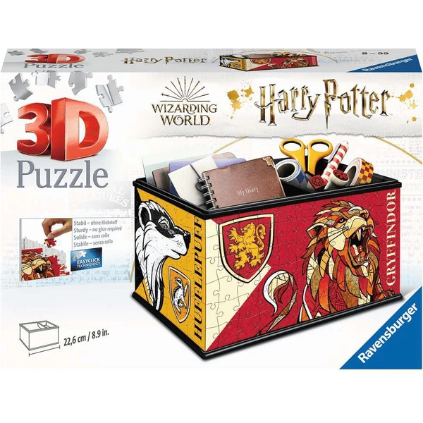 3D Puzzlespaß mit echtem WOW-Effekt!Ein Muss für alle Harry Potter Fans, die gerne Puzzeln und Platz für Ihren Krims-Krams suchen! Diese Box im Harry Potter Design ist der Hingucker in jedem Kinderzimmer und bietet Platz für wahre Schätze. Die Truhe besteht aus 216 individuell geformten Puzzleteilen und macht schon beim Zusammenbauen richtig viel Spaß. Teil für Teil nimmt die geräumige Aufbewahrungsbox ihre Gestalt an und enthüllt ihr magisches Design.Wer dabei einmal durcheinanderkommt, ist mit einem Blick auf die bebilderte Aufbauanleitung schnell wieder auf dem richtigen Weg. Die stabilen 3D Puzzleteile sind teilweise knickbar und für ein leichteres Zusammensetzen nummeriert. So vergeht die Puzzlezeit wie im Flug, und schon bald steht die Box als Hingucker in deinem Zimmer. Eine spielerische Konzentrationsübung für Anfänger sowie für Puzzleprofis – dank der Kunststoff-Zubehörteile ist die Aufbewahrungsbox absolut stabil und so richtig geräumig. Eine Box für die wichtigen Dinge im Leben und wahre Fans von Harry & Co.!