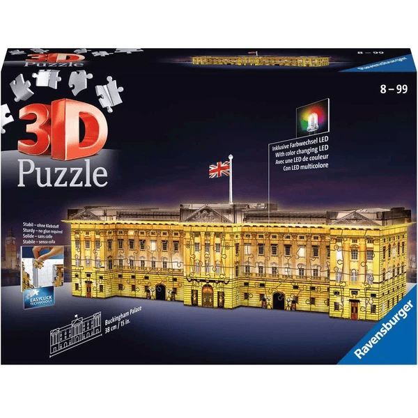 3D Puzzle Buckingham Palace Night EditionResidieren wie ein König – schaffen Sie sich Ihren eigenen Palast und lassen ihn erstrahlen!Einmal „bei Königs“ zuhause sein, wer möchte das nicht! Durch endlose Flure streifen, hinter verschlossene Türen blicken und wahrhaft königlich residieren – mit diesem Buckingham Palace in Miniaturformat hält das Britische Königshaus bei Ihnen Einzug und sorgt dank seiner Beleuchtung vor allem abends und nachts für wahrhaft königliche Momente!Die 216 individuell geformten und teils knickbaren Kunststoff-Puzzleteile passen dank EasyClick Technology perfekt zusammen und lassen sich so zu einem stabilen Bauwerk formen – ganz ohne kleben. Was den Aufbau für alle 8 bis 99 Jahre alten Königshaus-Fans ebenfalls erleichtert, ist die bebilderte Anleitung, die Einsteigern wie Fortgeschrittenen ungetrübten Puzzlespaß garantiert. Die ergänzenden Zubehörteile inklusive Flagge aus stabilem Kunststoff vervollständigen das Objekt und verleihen ihm den letzten Schliff.Der Clou bei diesem 38 x 12 x 11 cm großen Bauwerk: Das beiliegende Leuchtmodul erfreut mit zwei Funktionen, die das Modell wahlweise in einfarbig weißes Licht tauchen oder durch ein Farbwechselspiel in immer wieder anderen Farbtönen von innen erstrahlen lassen.